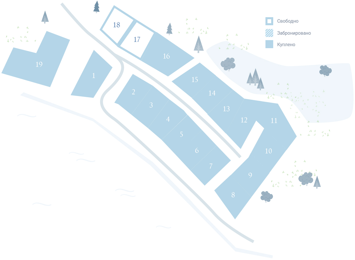 Живописный уголок в часе езды от Санкт-Петербурга, участки окружены взрослым сосновым лесом, каждое ваше утро будет начинаться с щебета птиц и бодрящего хвойного воздуха. Великолепие северной природы здесь сочетается с уединенностью и тишиной, а благодаря развитой инфраструктуре Вам не придется отвыкать от коммунальных благ, неотъемлемых в городе. Мы не стали трогать природный рельеф, поэтому с каждого участка, в том числе на второй линии, открывается прекрасный вид на озеро. Установлен сторожевой домик, ограждение по периметру территории, шлагбаум и ворота, обеспечивается круглосуточная охрана.